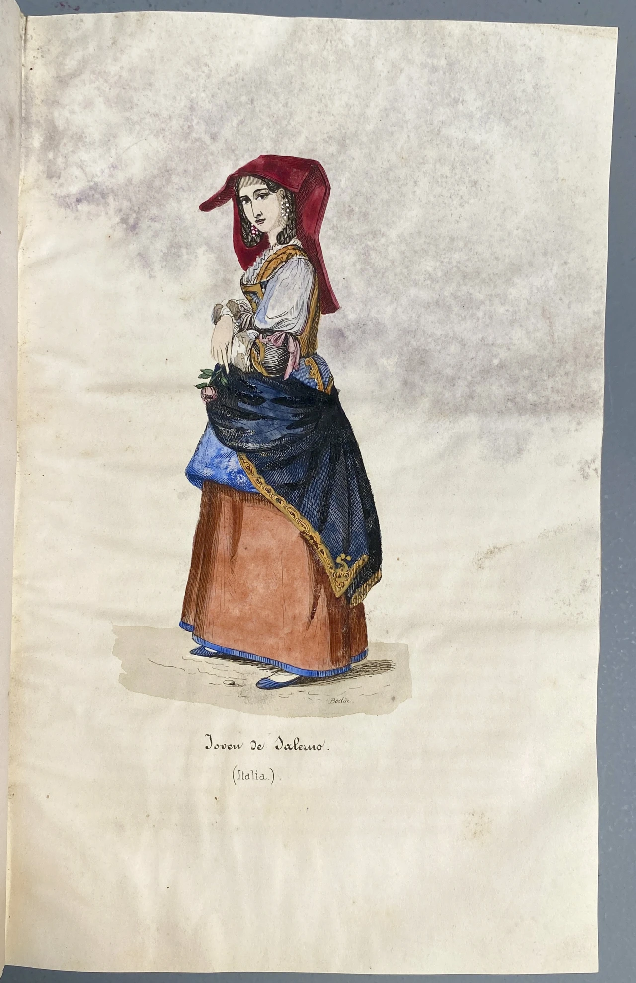 Costumbres, usos y trajes de todas las naciones. Barcelona, Francisco Oliva, 1847. 1v. In-8°. 558 pp. Profusamente ilustrado. Con muchas manchas de humedad, y manchas de óxido. Hoja de guarda, dañada. Algunas hojas sueltas. Encuadernación cartonaje en pleno cuero, dañado.