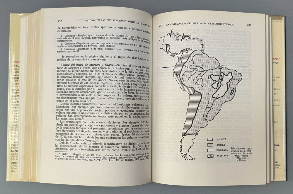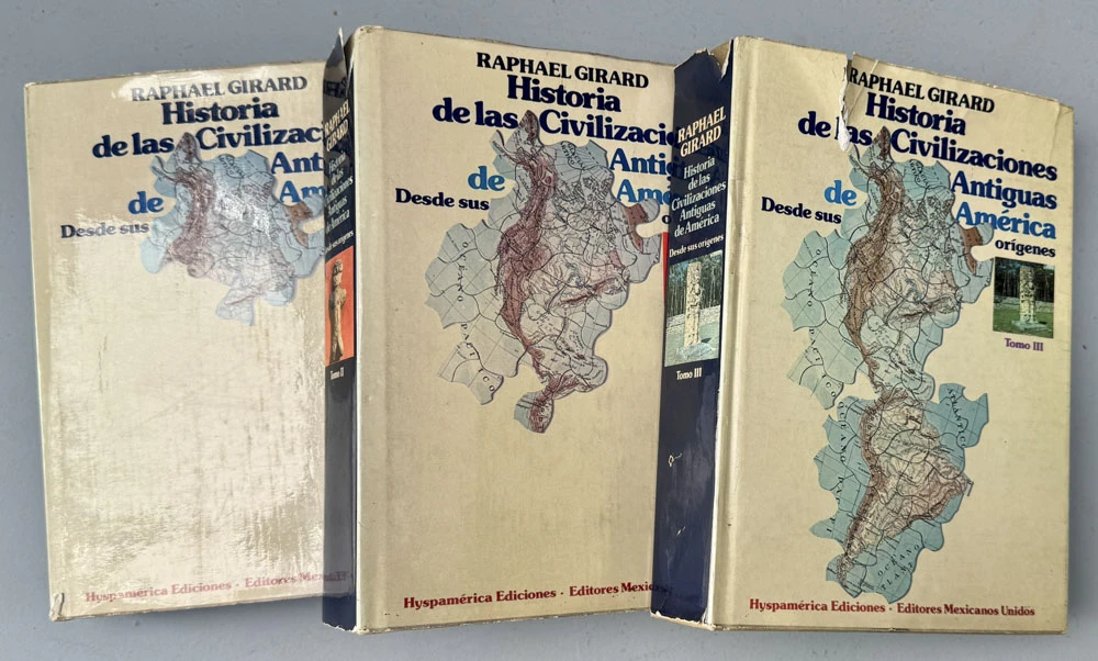 "Historia de las civilizaciones Antiguas de América desde sus orígenes". España, Hyspamerica, 1978. 3v. In-8º. Encuadernación cartonaje en plena tela beige, con títulos en verde. Con sobrecubiertas originales.