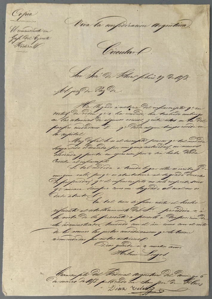Carta dirigida al Juez de Paz, fechada el 27 de febrero de 1853. En ella habla sobre ilegalidad de embargar estancias, advierte a los Jueces de Paz que el embargo a estancias de vecinos que se encuentran viviendo en Bs As, sin advertencia ni orden de autoridad competente, es de ningún valor porque atenta contra el sagrado derecho de propiedad. 1 carilla manuscrita, In-4º. Hilario Lagos estaba al frente del ejército que luchaba por disciplinar a Buenos Aires, que recién se había separado de la Confederación. Eustaquio Díaz Velez (héroe de las guerras por la independencia) había vuelto del exilio y colaboraba con el Gobierno de Buenos Aires.