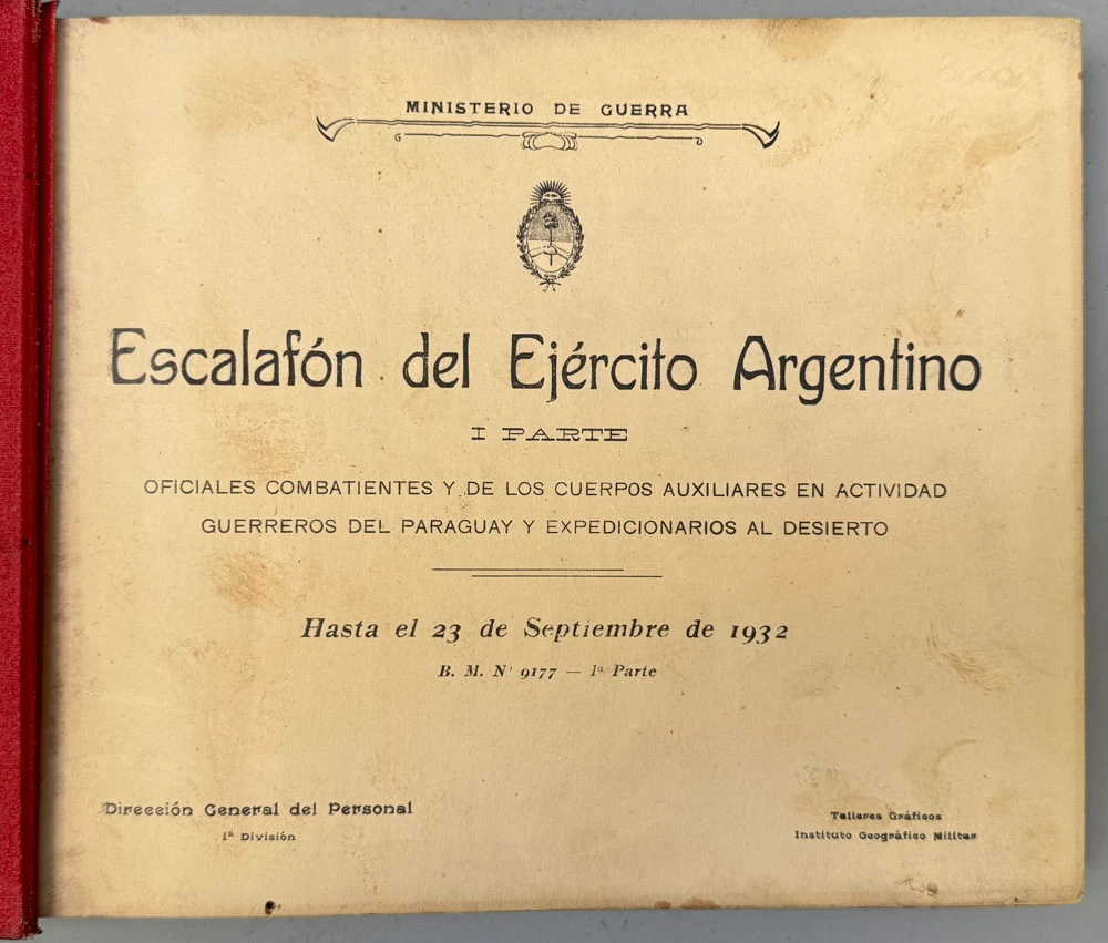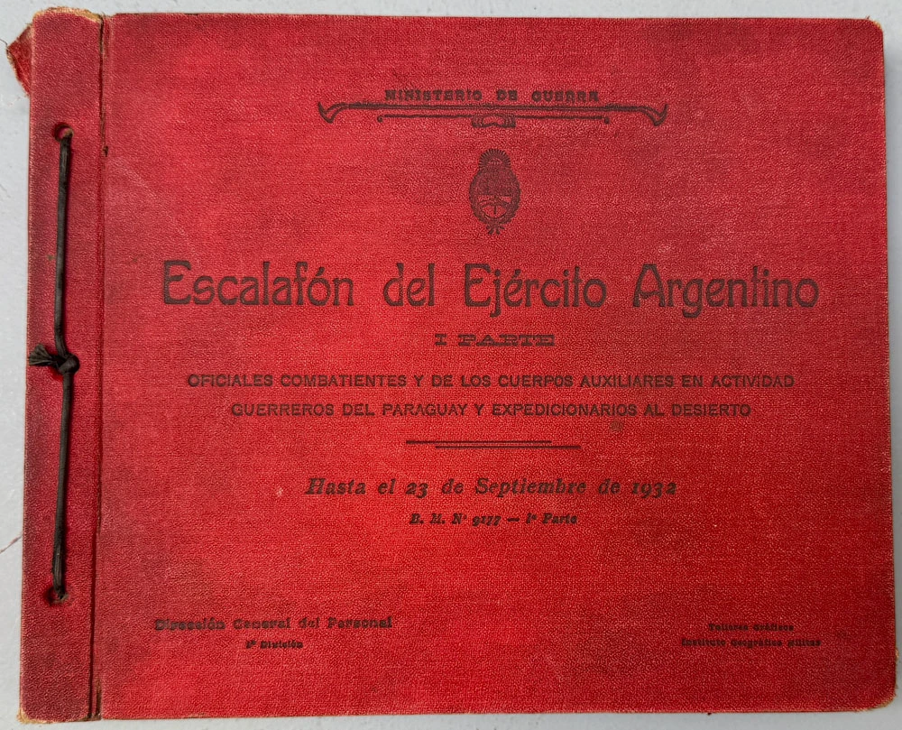 I parte. Oficiales combatientes y de los cuerpos auxiliares en actividad, Guerreros del Paraguay y Expedicionarios al Desierto. Hasta el 23 de septiembre de 1932. Dirección General del Personal 1ª División. Ministerio de Guerra, Talleres Gráficos Instituto Geográfico Militar. 1932. 1v. In-8º apaisado. 254 pp. Manchas de óxido. Encuadernación cartonaje en plena tela, lomo dañado.