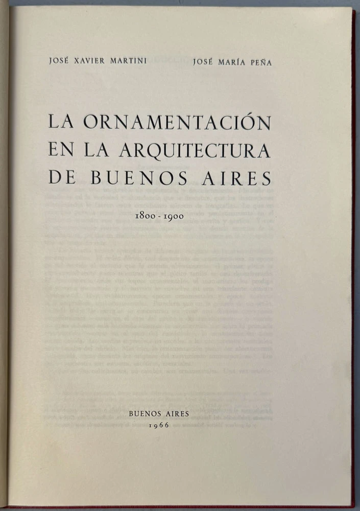 “La ornamentación en la arquitectura de Buenos Aires 1800-1900”. Buenos Aires, Universidad de Buenos Aires, 1966. 1v. In-4°. 64 pp. + ilustraciones fuera de texto. Encuadernación cartonaje en plena tela gastada, lomo con título en dorado.