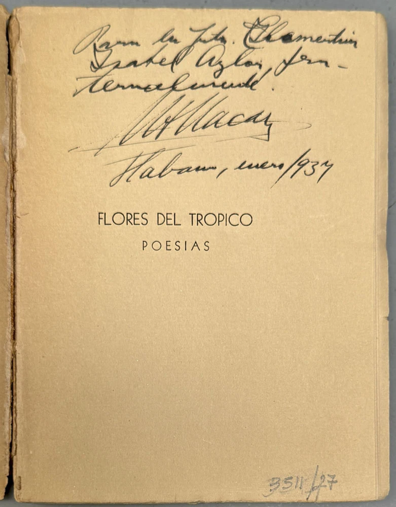 “Flores del trópico. Poesías”. Habana, Cultural S.A., 1936. 1v. In-8°. 158 pp. Ejemplar dedicado y firmado. Encuadernación de editor gastado. Lomo gastado. Junto con: BARRERA OSORIO, Abelardo. “Poemas de la noche azul”. México, Imprenta Oriente, 1942. 1v. In-8°. 101 pp. Ejemplar dedicado y firmado. Encuadernación de editor. Junto con: POTTS, Renee. “Fiesta mayor. Poemas”. La Habana, Talleres Tipográficos de Editorial Alfa, 1938. 1v. In-4°. 60 pp. Ejemplar dedicado y firmado. Encuadernación de editor con manchas, lomo gastado. Junto con: DE LASCANO TEGUI, Vizconte. “Álbum de familia”. Buenos Aires, Viau & Zona, Imprenta López, 1936. 1v. In-4°. 223 pp. Manchas de óxido. Ejemplar dedicado y firmado. Junto con: VIGNALE, Pedro-Juan. “Canciones para los niños olvidados”. Buenos Aires, J. Samet, Editor, Imprenta López, 1929. 1v. In-4°. 85 pp. Portada y viñetas de Eduardo Muñiz (hijo). Manchas de óxido. Encuadernación de editor gastado, lomo con roturas y faltantes.