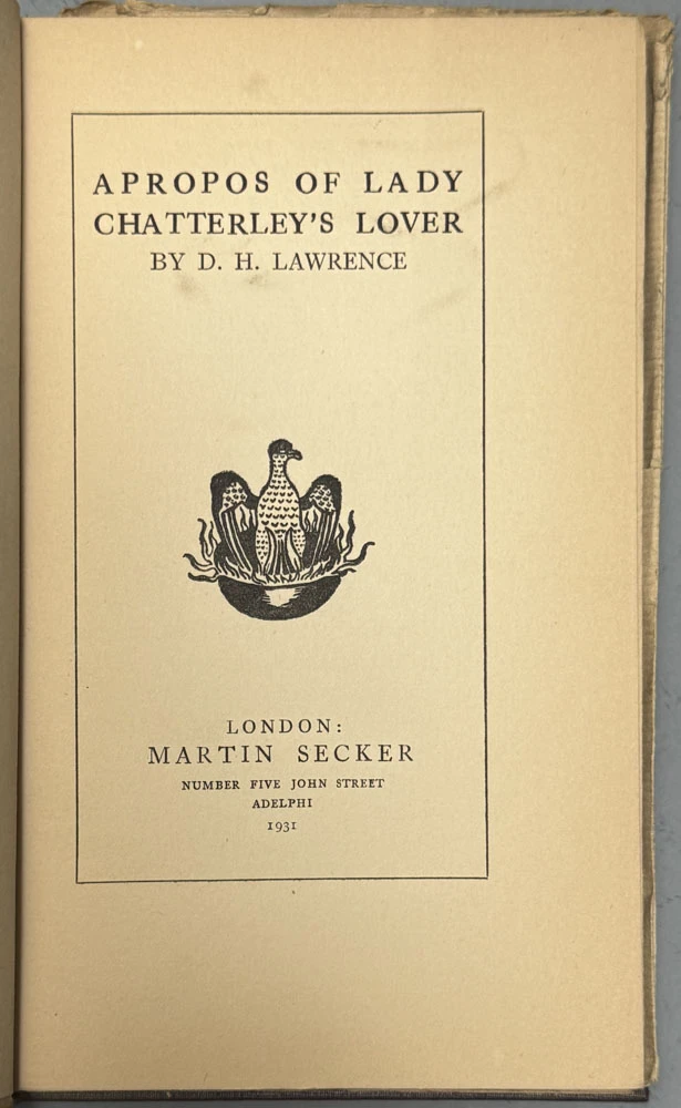 “The Captain’s doll”. London, Martin Secker, 1926. 1v. In-8°. 139 pp. Encuadernación plena tela encerada de editor. Junto con: LAWRENCE, D. H. “Apropos of Lady Chetterley’s lover”. London, Martin Secker, 1931. 1v. In-8°. 99 pp. Encuadernación plena tela encerada de editor. Dos tempranas reimpresiones de dos de sus obras más conocidas. David Herbert Richards Lawrence (1885-1930) fue un escritor inglés, cuyas obras abordaron cuestiones relacionadas con la salud emocional, la vitalidad, la espontaneidad, la sexualidad humana y el instinto. Sus opiniones sobre todos estos temas, en particular sobre la homosexualidad, le causaron en su época la censura en varias ocasiones. Para Lawrence, la mujer ejercía una influencia sobre el hombre que cuestionaba su integridad y masculinidad.
